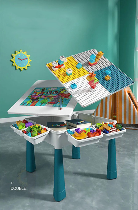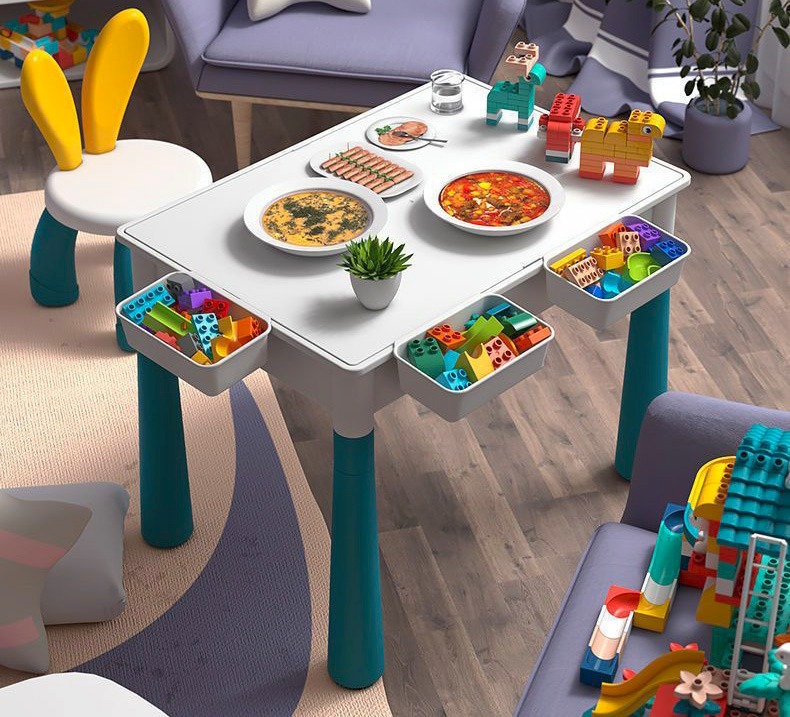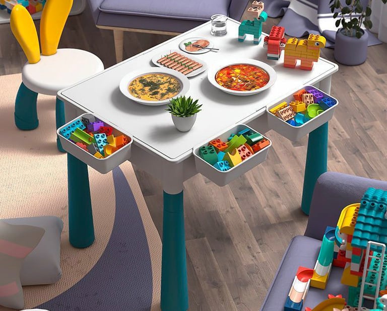 that serves as a toy storage box, dining table, desk, drawing board, paddling pool, and children's indoor sandpit.